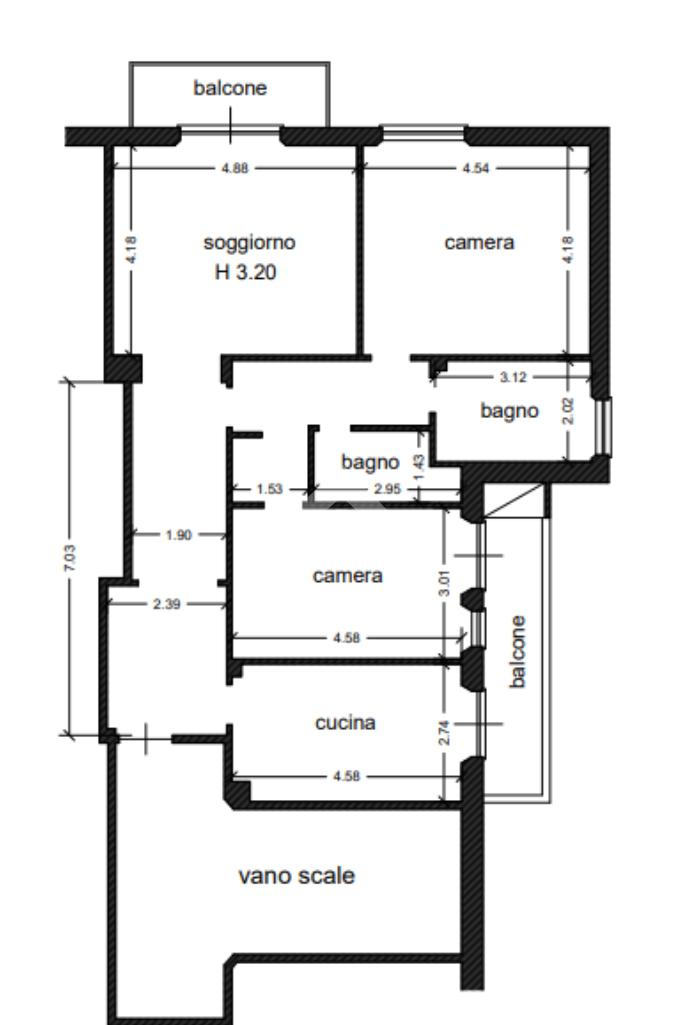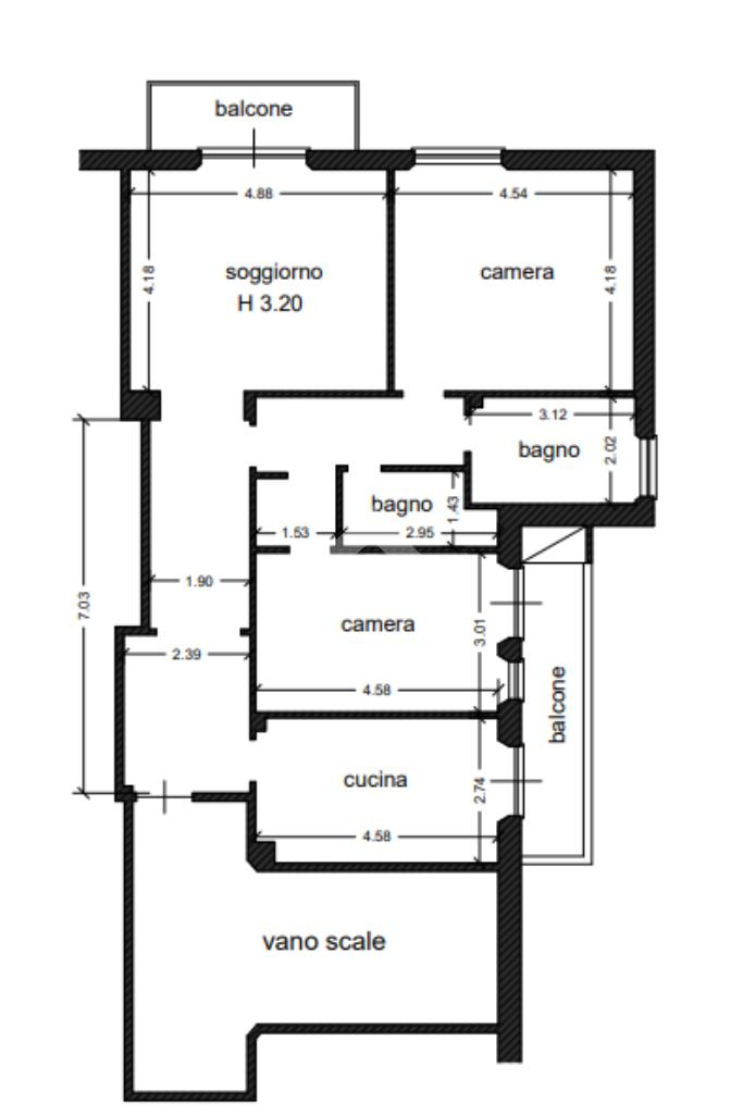 L'appartamento è così composto ingresso in corridoio, una cucina abitabile spaziosa, un' ampia sala con accesso a uno dei due balconi, due camere matrimoniali ben proporzionate, due bagni di cui uno più piccolo e un secondo balcone che collega in modo pratico la cucina e una delle camere.